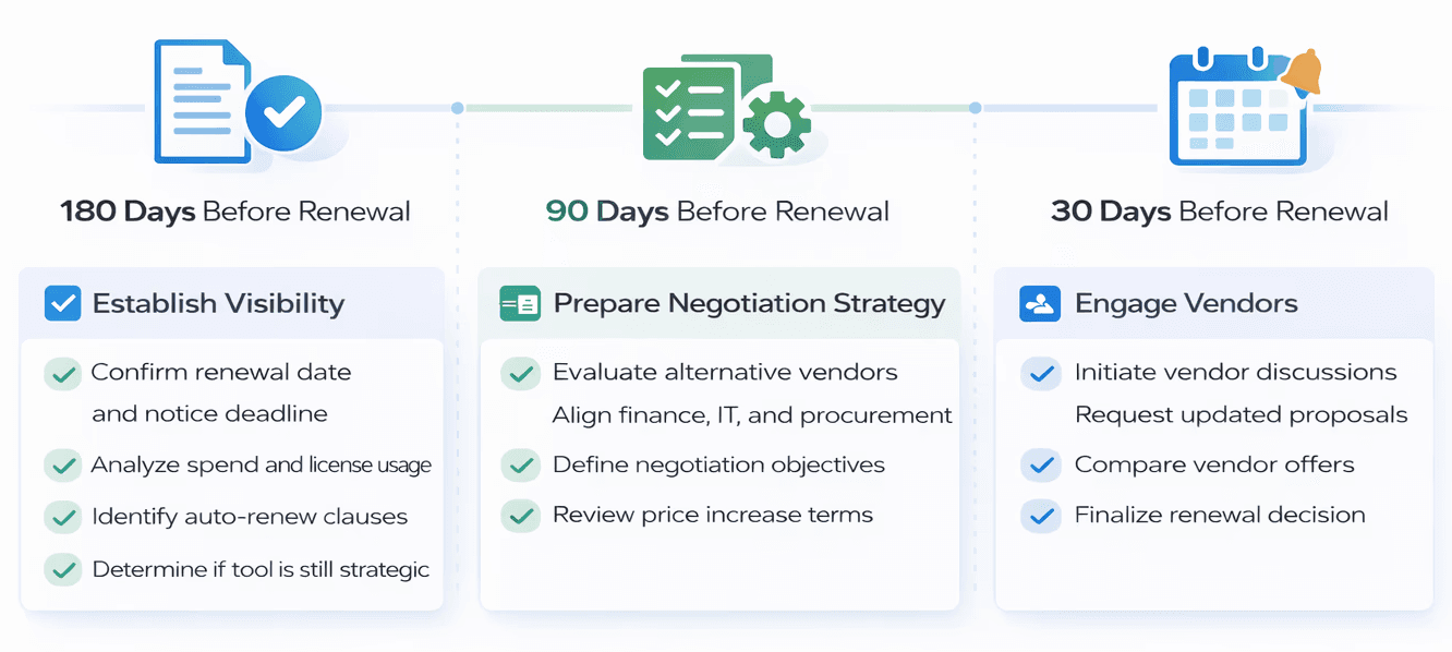 What finance, IT, and procurement teams should review 180, 90, and 30 days before SaaS contracts renew.